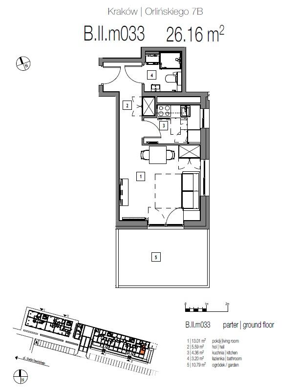 We offer for sale a finished and furnished 1-room apartment with access to the garden of an area of 26,16 sqm located on the ground floor in a new building with a lift on Orlińskiego Street (Czyżyny).