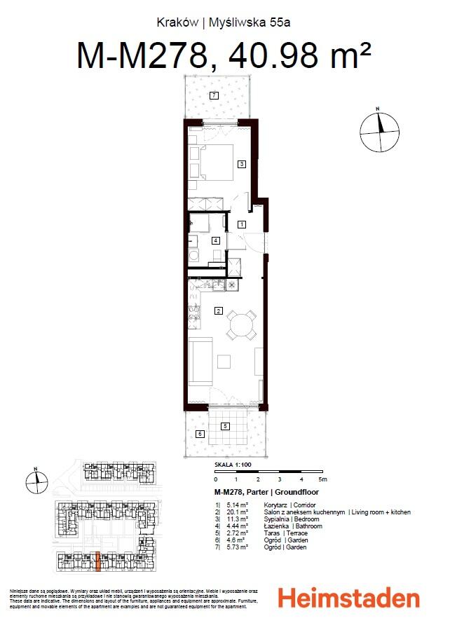 We offer for sale a finished and furnished 1-bed apartment with access to two gardens of an area of 40,98 sqm located on the ground floor in a new building with a lift on Mysliwska Street (Podgorze district).
