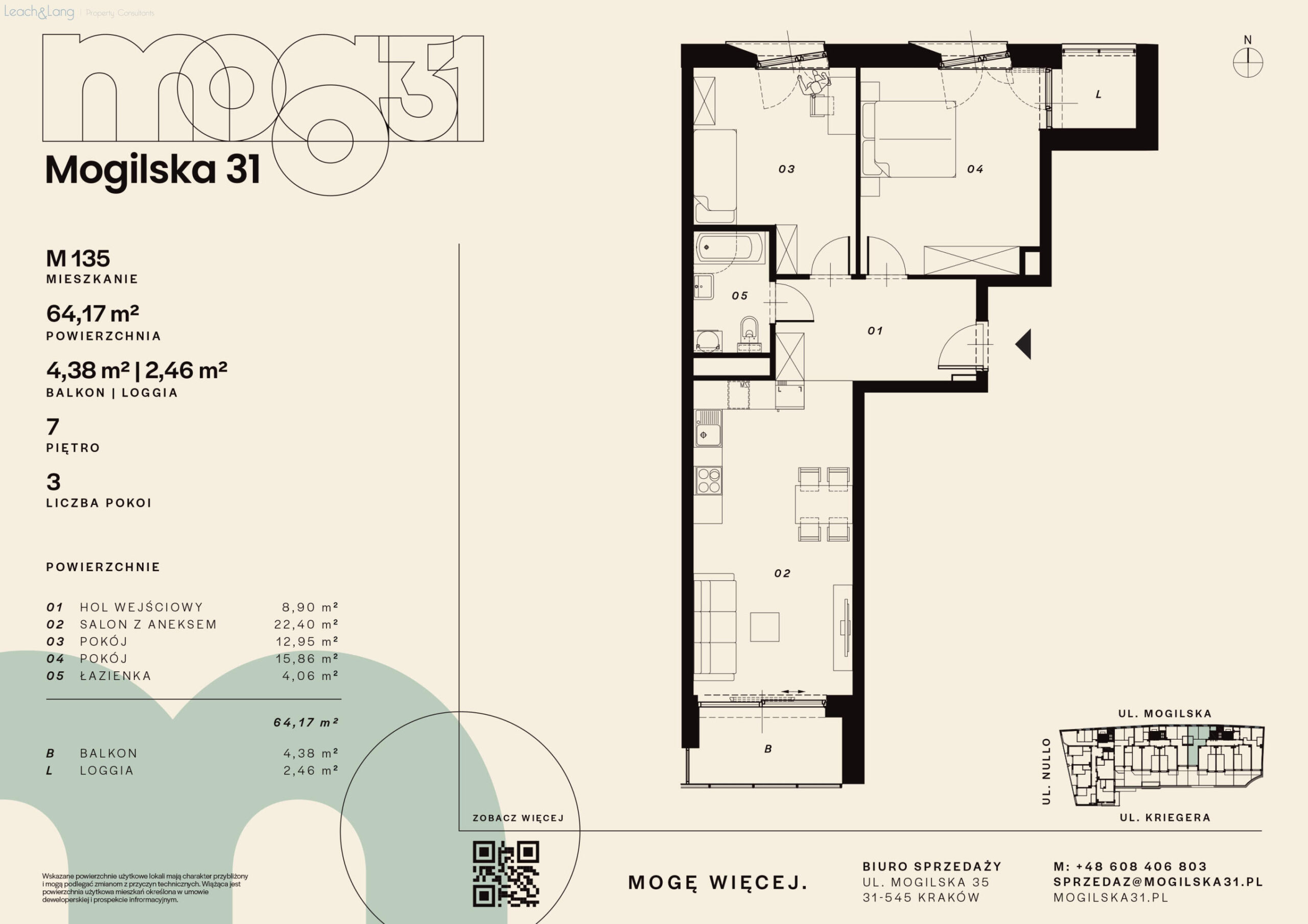 Leach & Lang, acting as the exclusive sales agent for the new Mogilska 31 development (direct offer no commission), is pleased to present a modern apartment for sale, located in the very centre of the city, on Mogilska Street in Kraków. The property is situated in one of the best-connected areas of the city, just a few steps from Rondo Mogilskie.